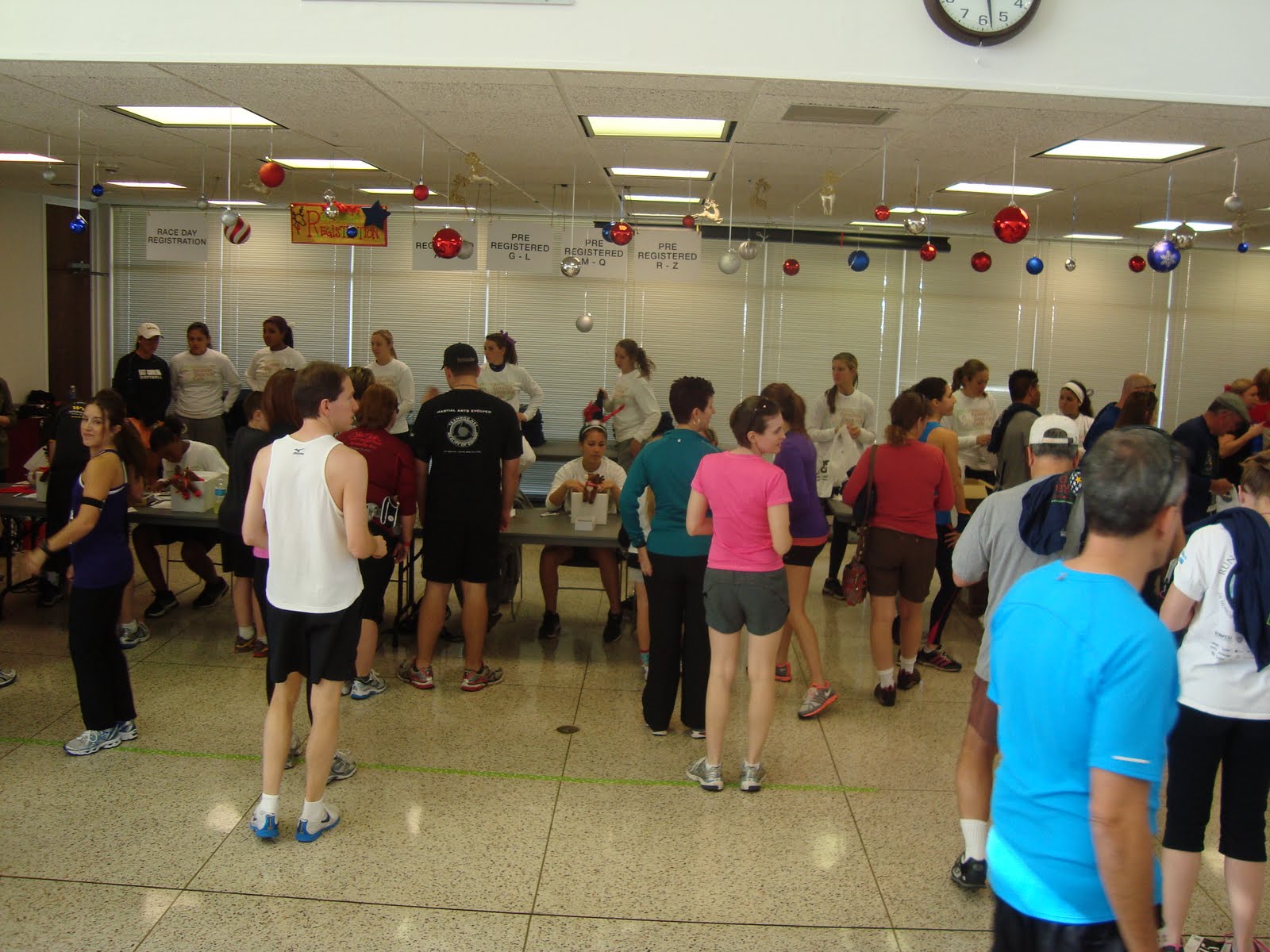 We were blessed with one of those wonderful-weather days in North Carolina, where December temperatures can reach into the high 60s. Shorts and tech shirts were plenty warm, as the sun beat down on us from an almost cloud-free sky. One of the most-frequently-heard topics of pre-race discussions was how much better this weather was than the previous year, when it was much colder and wetter. The race organizers mentioned during the pre-race announcements that it was the best weather they had ever had for the race, and Gary and Rachel, who had taken part in the 5k in previous years, agreed.Everything was hopping in the building where packet pickup and race-day registration was taking place. The excellent weather was contributing to more walk-up registrations, and lots of people were milling about, waiting on restrooms, and coming and going from the park behind the building that faced the Tar River. Even with the warm weather, there were lots of folks wearing Christmas-themed costumes, from ladies with candy-cane-striped socks to lots of Santa and Rudolph hats to one sugar plum fairy, and even one guy running the 10-miler in a full, head-to-toe brown fur reindeer outfit. The announcements began ushering everyone out to the road where the start would take place, and the ECU Club Dance team performed for everyone and we got to hear from one of the Capt. Cash Scholarship recipients before we had a false start on the national anthem (all the runners joined in to finish it).